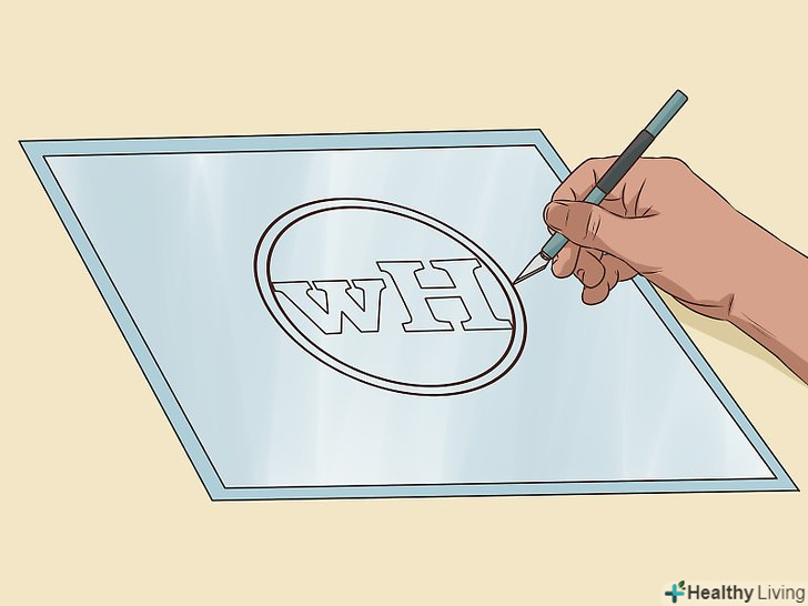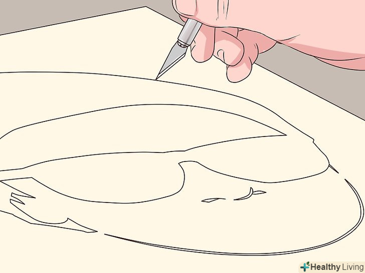 Виріжте трафарет. зніміть самоклеючу плівку з вихідного малюнка, але все ще не видаляйте з неї підкладку. Покладіть самоклеящуюся плівку на килимок для розкрою і виріжте контури трафарету гострим ножем для виробів. Якщо у трафарету є внутрішні окремі частини, дотримуйтесь обережності, щоб їх випадково не викинути. [3]