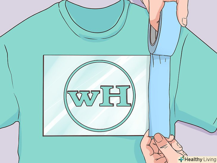 Приклейте трафарет до футболки малярським скотчем. покладіть трафарет на футболку в тому місці, де хочете розмістити малюнок. Розправте будь-які хвилі і складки на тканині, а потім приклейте трафарет малярським скотчем з усіх чотирьох сторін. [14]