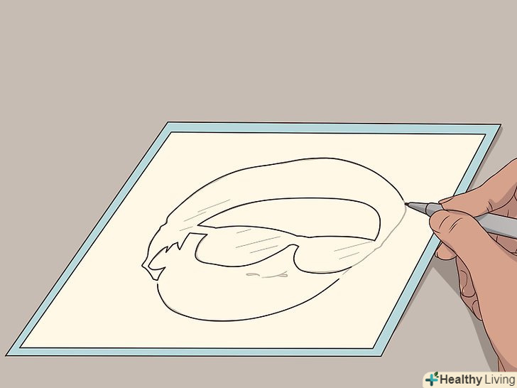Перенесіть контури дизайну на односторонню вощений папір. спочатку закріпіть вихідний малюнок скотчем на столі, щоб він не зміщувався, а потім накладіть зверху і теж закріпіть вощений папір глянцевою стороною вниз. Знову скористайтеся ручкою, щоб перенести контури малюнка на вощений папір. [6]- Якщо вам складно розглянути вихідний малюнок через вощений папір, спробуйте скористатися столом з нижньої підсвічуванням або ж склом добре освітленого вікна.