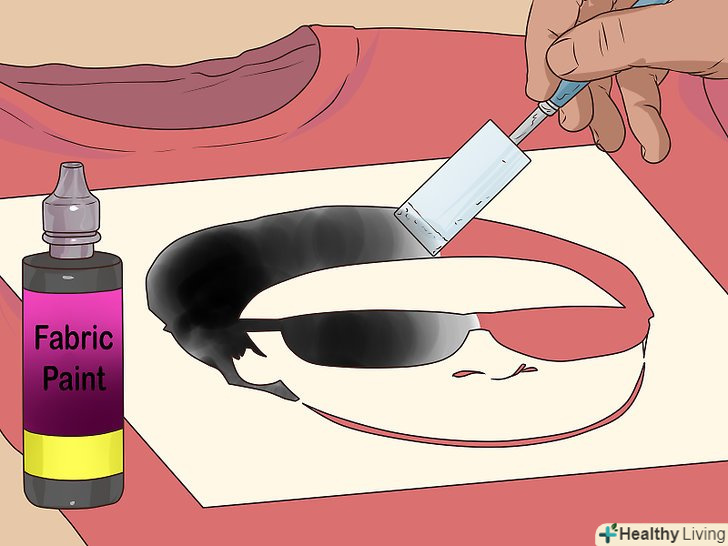 Нанесіть фарбу для текстилю поверх трафарету за допомогою губчастої кисті або губки. капніть трохи фарби для текстилю на паперову тарілку, кришку, піддон або інший аналог палітри. Занурте губчасту кисть у фарбу, а потім почніть прикладати її до трафарету. Не фарбуйте трафарет мазками в напрямку туди і назад, щоб випадково не просочити футболку фарбою занадто сильно. [10]- Можна нанести на футболку кілька шарів фарби. Тільки почекайте близько 20 хвилин, перш ніж наносити кожен наступний шар. [11]