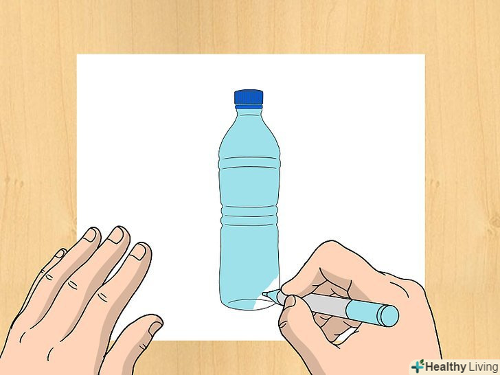На цій стадії можна зайнятися деякими деталями. домалюйте верхній рівень води і проведіть кілька рис, що створюють видимість того, що пляшка проглядається наскрізь.