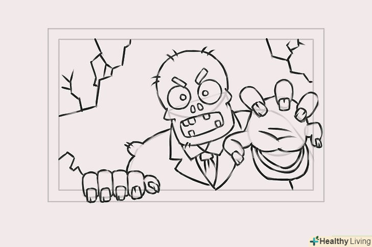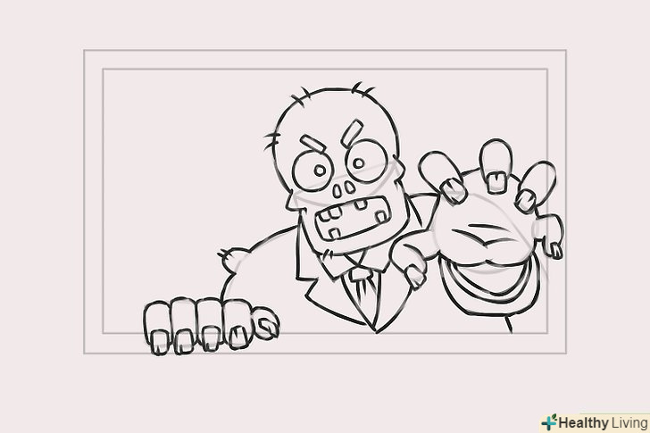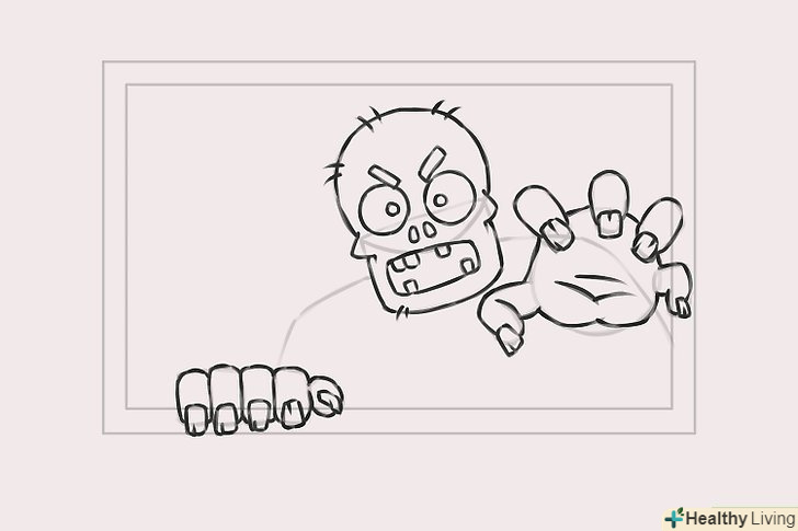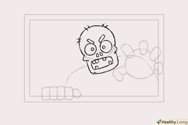 Намалюйте руки зомбі. долоню позначте кругом. Накидайте пальці від долоні, тоді як пальці іншої руки намалюйте схопилися за раму вікна.