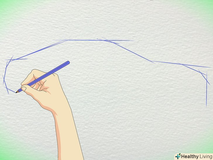 Намалюйте вигнуту лінію від верхньої частини двох ліній (намальованих на попередньому кроці: * криві у формі даху машини.* Потім продовжуйте до досягнення нижньої частини машини / колеса