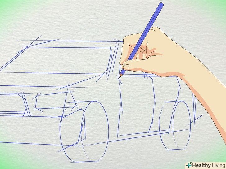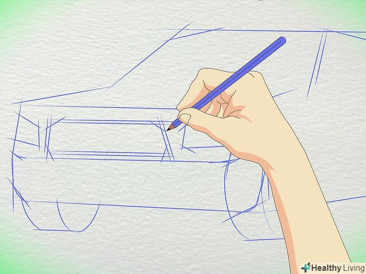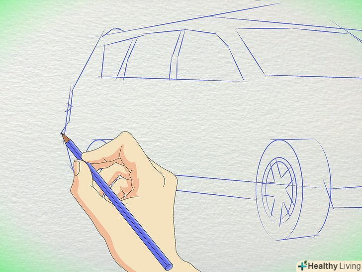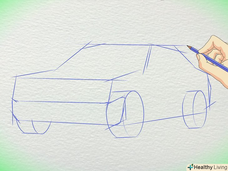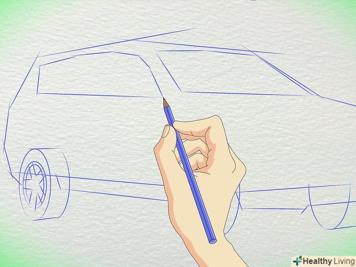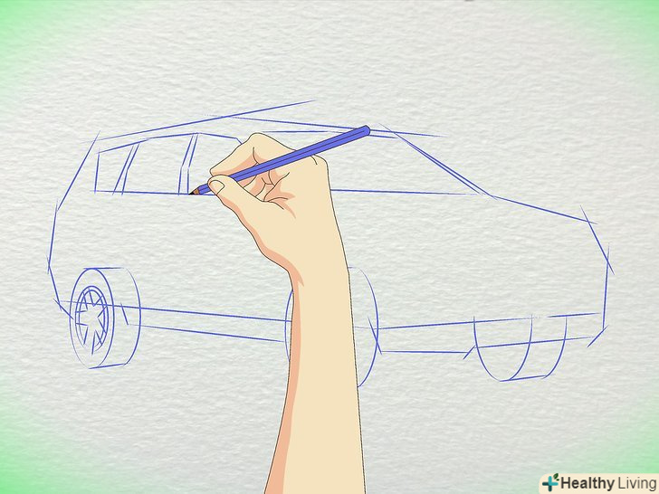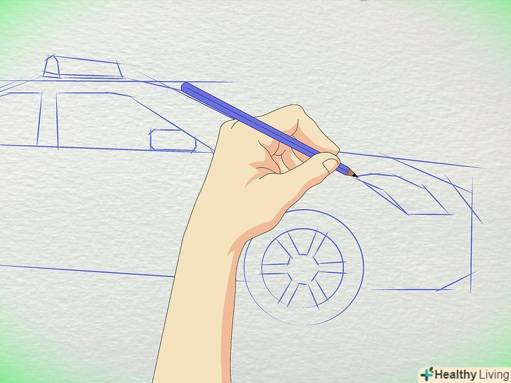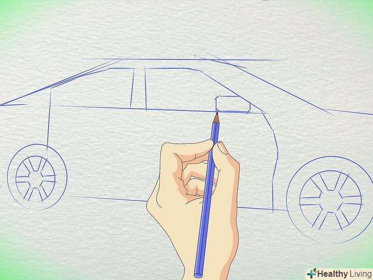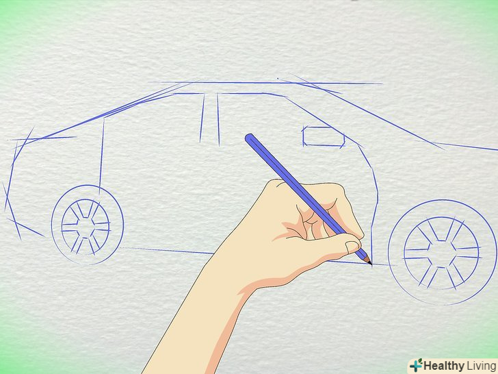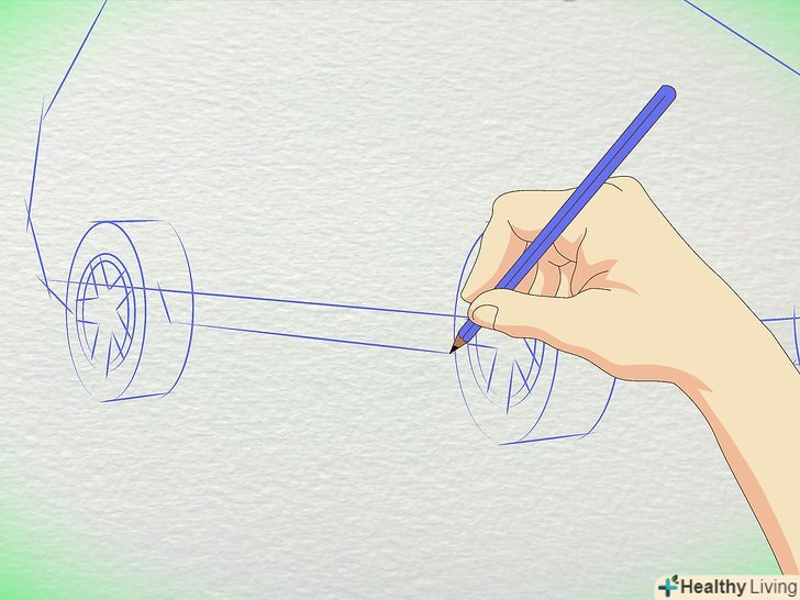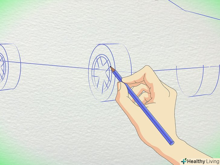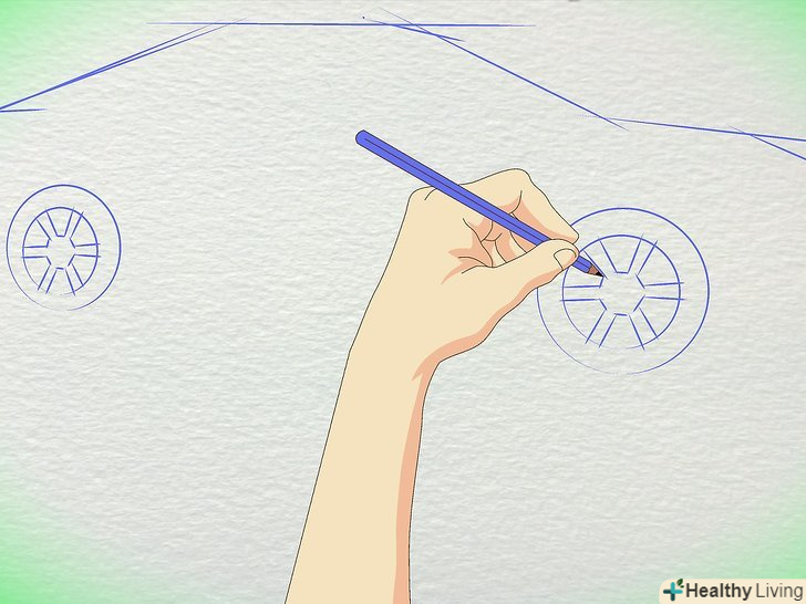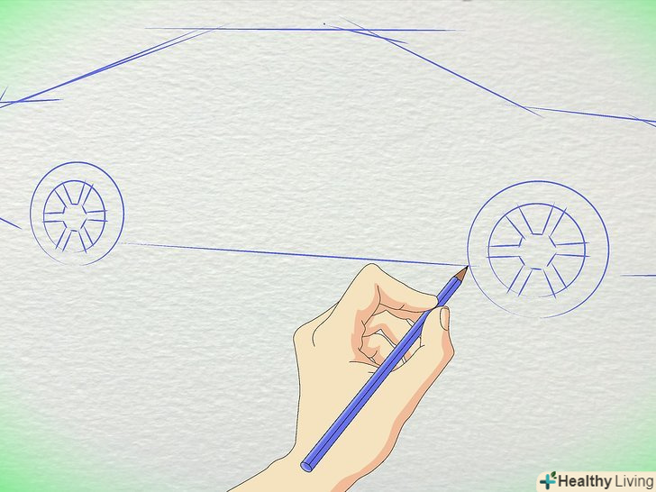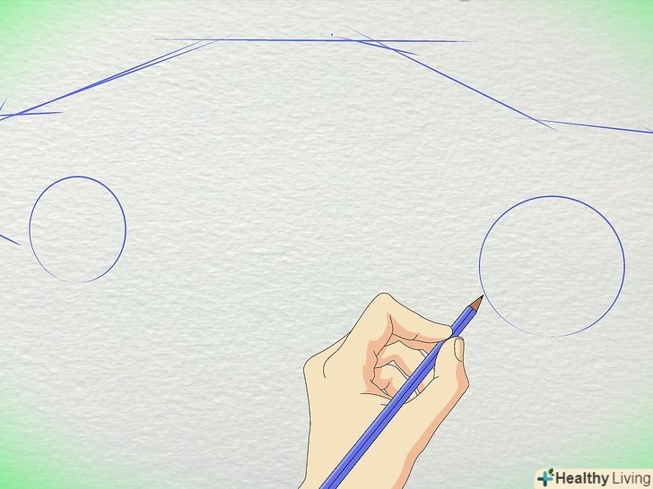 Намалюйте коло для коліс. Пам'ятайте, що колеса набагато далі один від одного, ніж більшість людей думають. Заднє колесо знаходиться приблизно під заднім склом, з'єднуючись з багажником. Переднє колесо знаходиться під капотом.