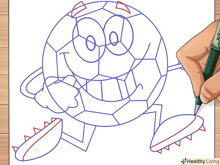 Над очима, трохи виступаючи за контури кола, намалюйте брови; також не забудьте додати до стоп лінію підошви і шипи на бутсах.