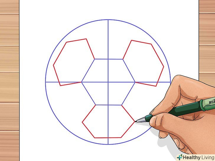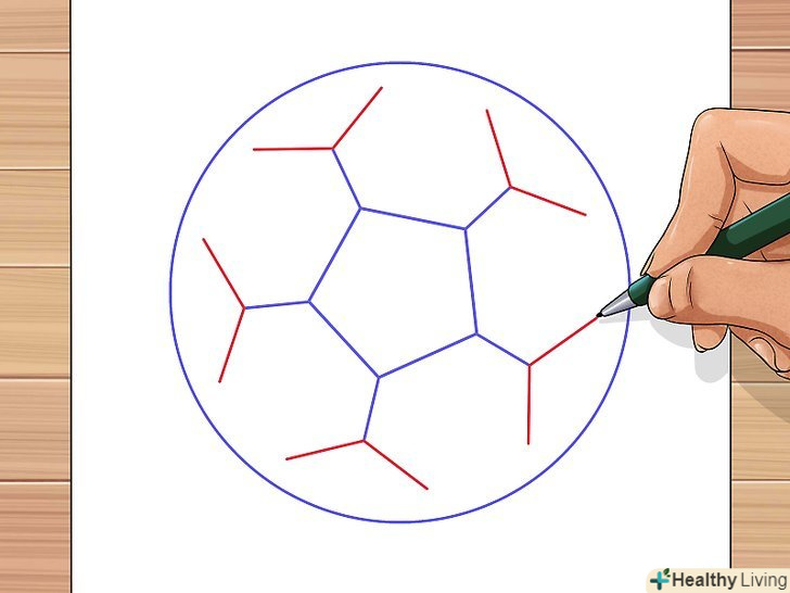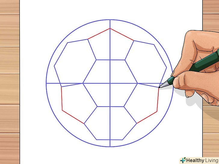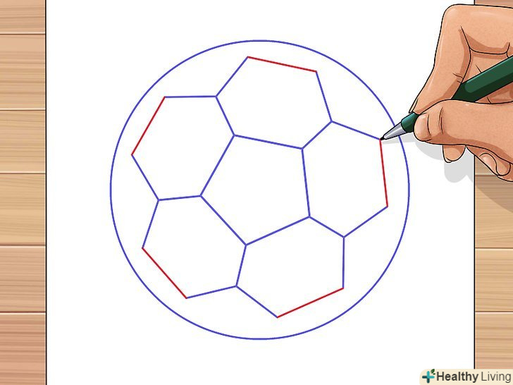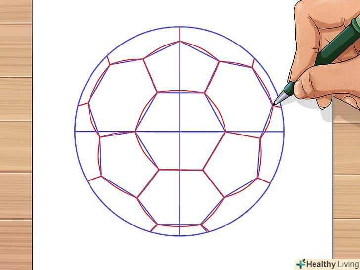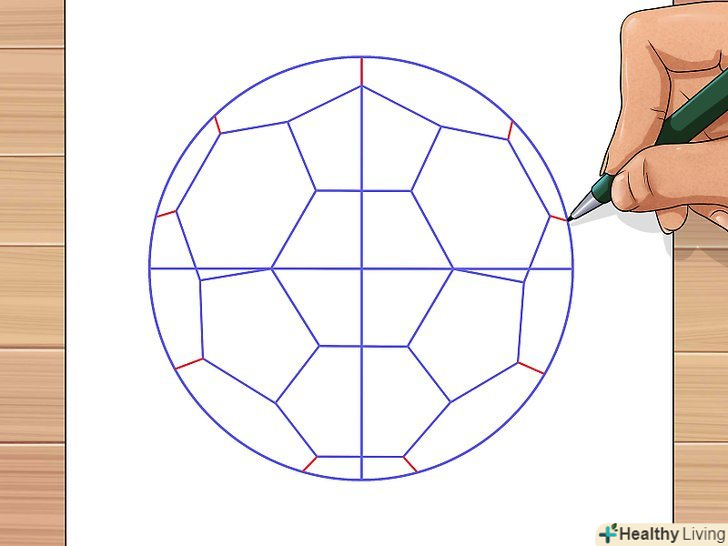 Для завершення роботи над контурами м'яча з'єднайте зовнішні вершини шестикутників з лінією кола.