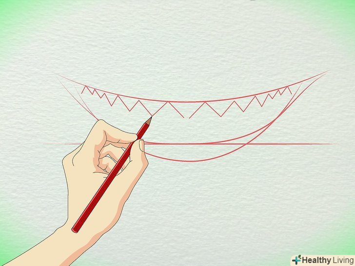 Намалюйте нижню частину зубів. для цього намалюйте трикутники, де низхідні лінії зустрінуться з "лінією зубів".- Майже в кожній конфігурації зубів, ви виявите, що третій зуб (з обох сторін) від центру середньої лінії має кінець гостріше, ніж кінці інших зубів. Запам'ятайте, такі маленькі нюанси, як цей, зроблять ваш малюнок більш реалістичним.
