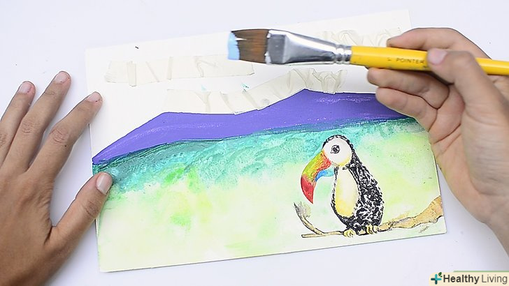 - Для створення чітких граней, накладайте на полотно малярський скотч. малярський скотч можна використовувати в малюванні точно так же, як його застосовують під час ремонту, наприклад, при фарбуванні стелі. Наклейте скотч безпосередньо на полотно або на вже висохлу фарбу, щоб не пошкодити її. Гарненько притисніть скотч до полотна, щоб свіжа фарба не могла проникнути під нього. Коли намалюєте необхідну Вам чітку грань, зніміть скотч, щоб побачити ідеально рівну лінію.