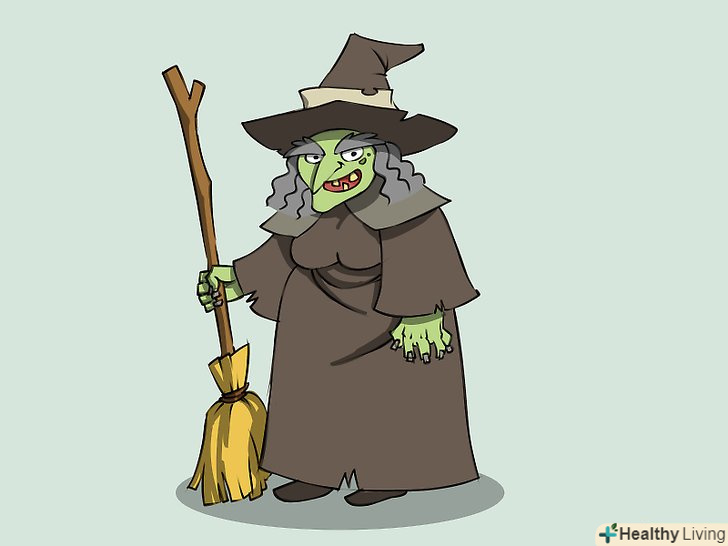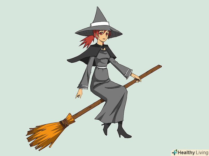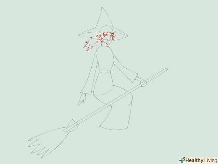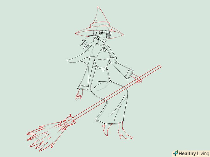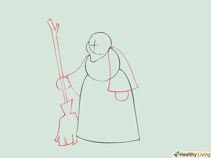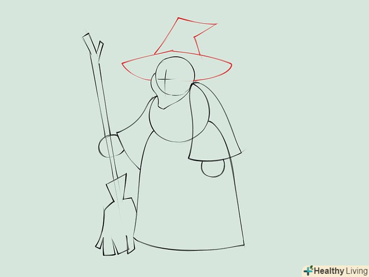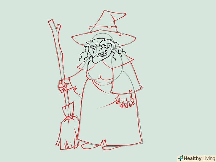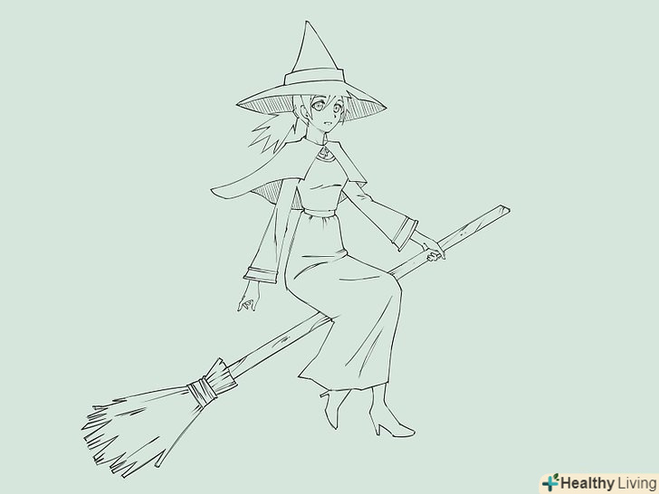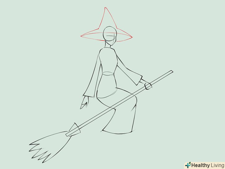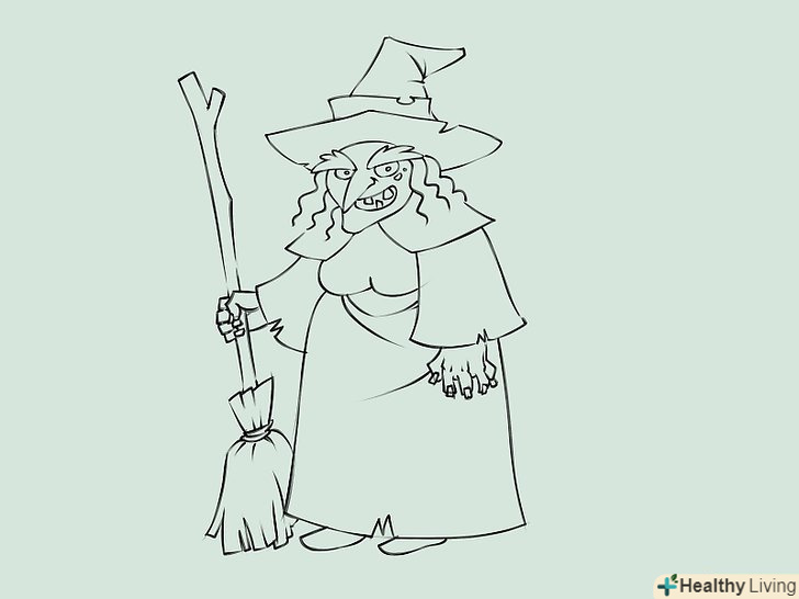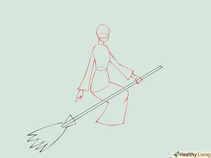 Намалюйте силует відьми, яка сидить на мітлі. для голови намалюйте коло з загостреною нижньою частиною і незграбні щоки і підборіддя. Намалюйте дві короткі паралельні лінії в якості шиї, поєднуючи голову з тулубом. Намалюйте Інші частини тіла, зображуючи довгу мантію. Намалюйте руки, одна з них тримає мітлу.