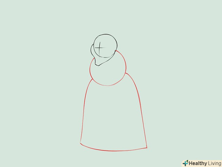 Нижче голови намалюйте тулуб відьми. зробіть його пухким і округлим. Спідницю намалюйте у формі дзвону.