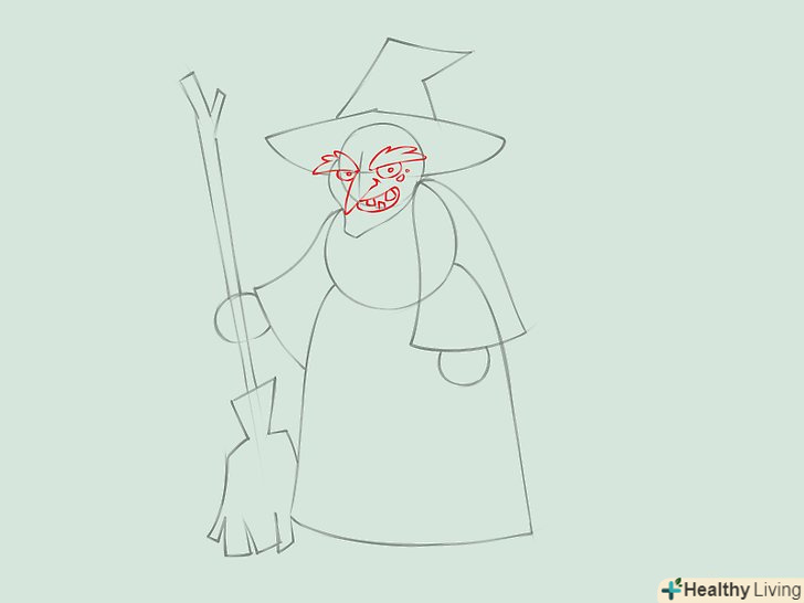 Додайте деталі обличчя. намалюйте густі брови, великі круглі очі, маленькі кружечки-бородавки, великий загострений ніс, трохи відкритий рот з неповним набором зубів, що зробить відьму неприємною на вигляд.