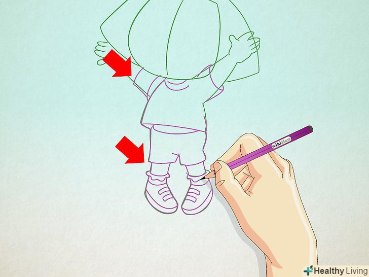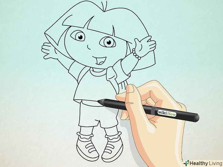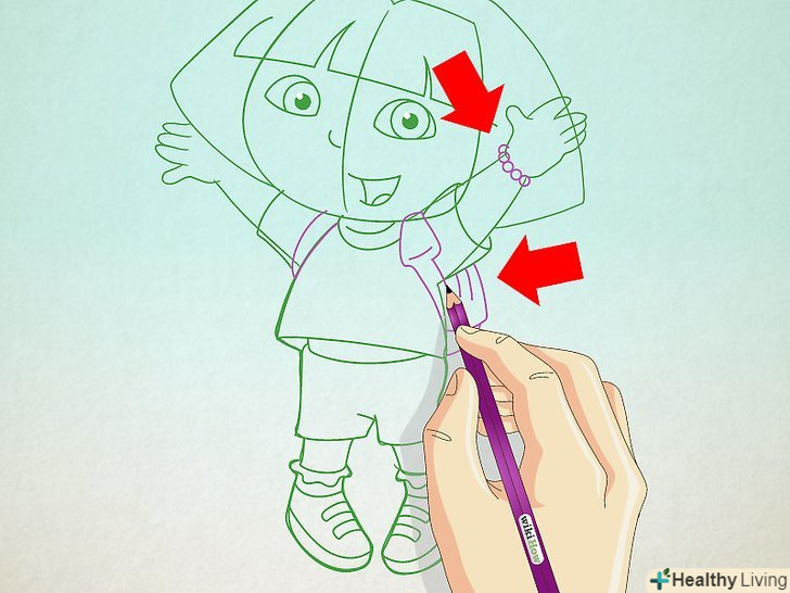 Додайте рюкзак, браслети і кілька ліній для деталізації рук і шортів. Додайте рюкзак, браслети і кілька ліній для деталізації рук і шортів.