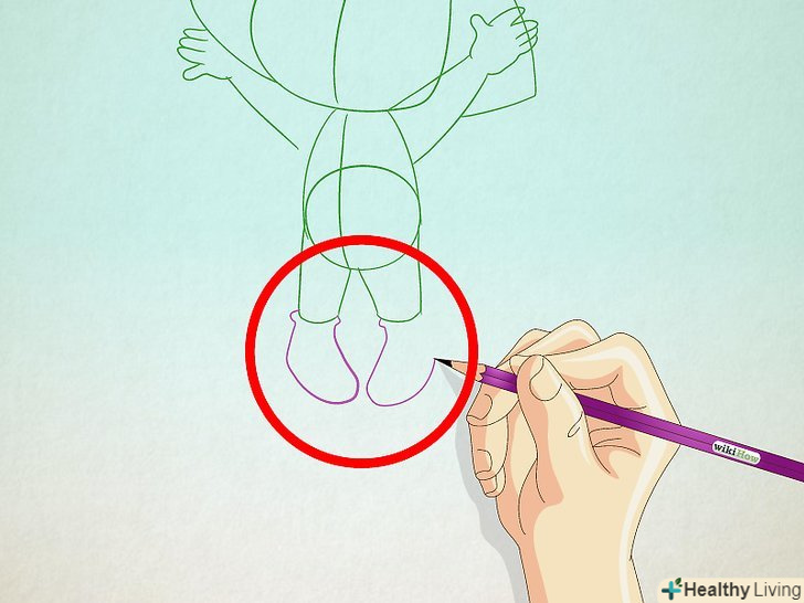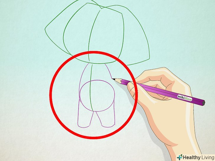 Почніть малювати її тіло. у верхній частині тіла намалюйте половину овалу, потім знизу домалюйте коло і додайте два прямокутника в якості ніг. Почніть малювати її тіло. у верхній частині тіла намалюйте половину овалу, потім знизу домалюйте коло і додайте два прямокутника в якості ніг.