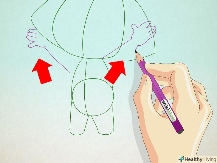 Намалюйте плечі і руки. на малюнку вона як би говорить " Привіт!". тому її права рука повинна бути піднята, а ліва - дивитися трохи в сторону від тіла. Намалюйте плечі і руки. на малюнку вона як би говорить " Привіт!". тому її права рука повинна бути піднята, а ліва - дивитися трохи в сторону від тіла.