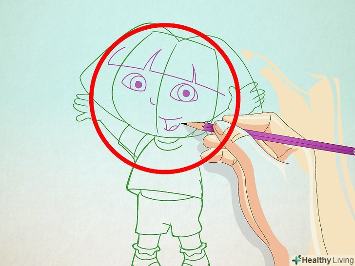 Намалюйте деталі особи - чубок, очі, ніс і усміхнений рот. Намалюйте деталі особи - чубок, очі, ніс і усміхнений рот.