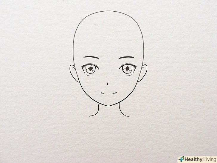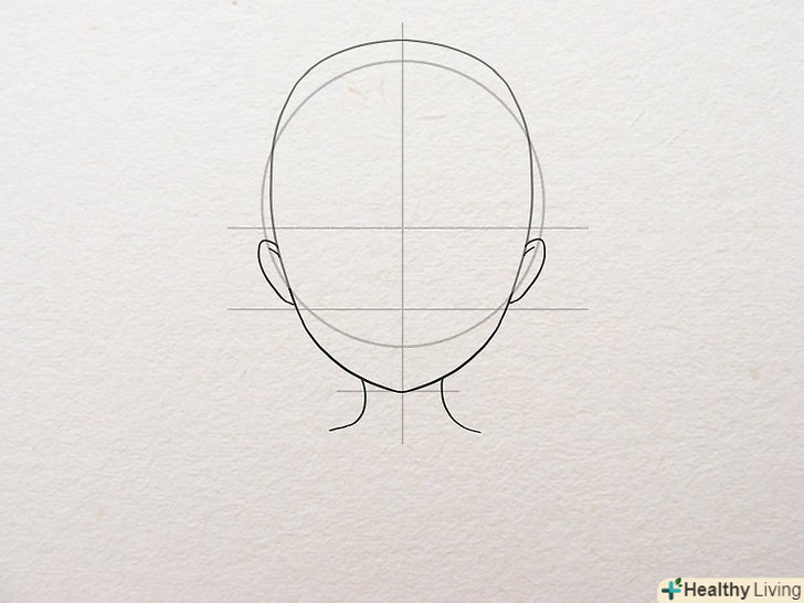Проведіть під головою контури шиї. Ширина шиї залежить від того, чоловічий чи жіночий персонаж ви малюєте. Якщо ви зображуєте чоловічий персонаж, розташуйте краю шиї ближче до бічних сторонах щелепи, щоб передати м'язисту статуру. У разі жіночого персонажа намалюйте лінії шиї ближче до підборіддя, щоб вона вийшла тонше. Проведіть прямі вертикальні лінії від щелепи з обох сторін обличчя, щоб позначити шию. [6] Проведіть під головою контури шиї. Ширина шиї залежить від того, чоловічий чи жіночий персонаж ви малюєте. Якщо ви зображуєте чоловічий персонаж, розташуйте краю шиї ближче до бічних сторонах щелепи, щоб передати м'язисту статуру. У разі жіночого персонажа намалюйте лінії шиї ближче до підборіддя, щоб вона вийшла тонше. Проведіть прямі вертикальні лінії від щелепи з обох сторін обличчя, щоб позначити шию. [6]- Юні персонажі в стилі манга або аніме мають більш тонкі шиї, так як вони менш м'язисті або ще не сформувалися повністю. Якщо ви малюєте хлопчика чи дівчинку, розмістіть лінії шиї ближче до центру підборіддя.