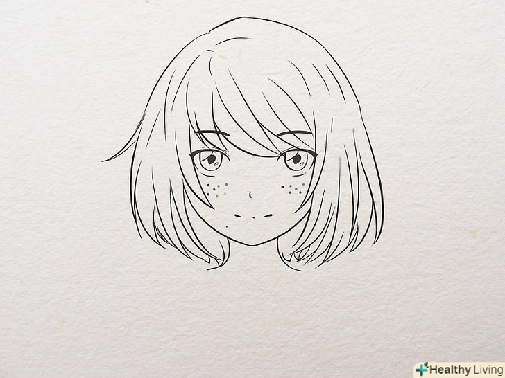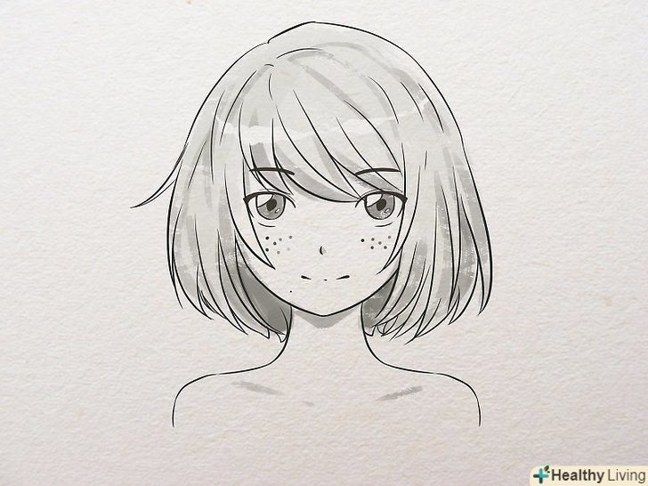 Доповніть обличчя персонажа дрібними деталями, наприклад веснянками або зморшками. після того як ви намалюєте волосся і зітрете допоміжні лінії, додайте деталі, щоб надати персонажу унікальність. Наприклад, зобразіть на щоках веснянки, родимки або зморшки. Можна також домалювати прикраси і різні аксесуари. Використовуйте олівець, щоб можна було стерти те, що вам не сподобається. [14] Доповніть обличчя персонажа дрібними деталями, наприклад веснянками або зморшками. після того як ви намалюєте волосся і зітрете допоміжні лінії, додайте деталі, щоб надати персонажу унікальність. Наприклад, зобразіть на щоках веснянки, родимки або зморшки. Можна також домалювати прикраси і різні аксесуари. Використовуйте олівець, щоб можна було стерти те, що вам не сподобається. [14]- Можна не додавати ніяких деталей, якщо ви не хочете робити цього.