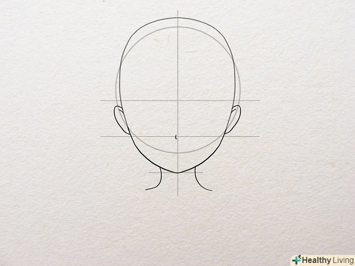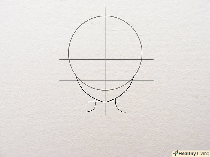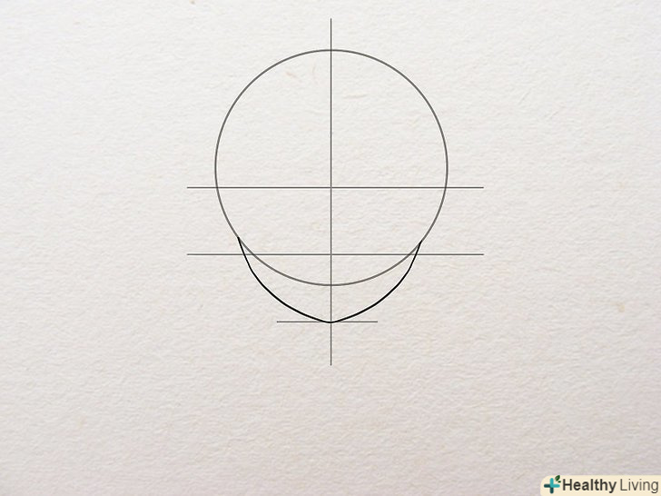 Проведіть нижче кола горизонтальну лінію, щоб позначити підборіддя. знайдіть відстань від центру кола до тієї лінії, яка відповідає кінчика носа. Відміряйте таку ж відстань від лінії носа вниз і проведіть тут невеликий горизонтальний відрізок так, щоб центральна вертикальна лінія перетинала його посередині. На цій лінії буде розташовуватися край підборіддя. [4] Проведіть нижче кола горизонтальну лінію, щоб позначити підборіддя. знайдіть відстань від центру кола до тієї лінії, яка відповідає кінчика носа. Відміряйте таку ж відстань від лінії носа вниз і проведіть тут невеликий горизонтальний відрізок так, щоб центральна вертикальна лінія перетинала його посередині. На цій лінії буде розташовуватися край підборіддя. [4]- Якщо ви малюєте жіночий персонаж, проведіть цей відрізок на відстані ⅓ діаметра кола, оскільки у жіночих персонажів в стилях аніме і манга більш округлі обличчя.