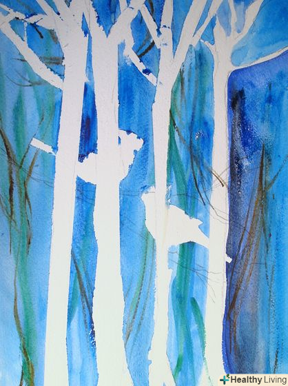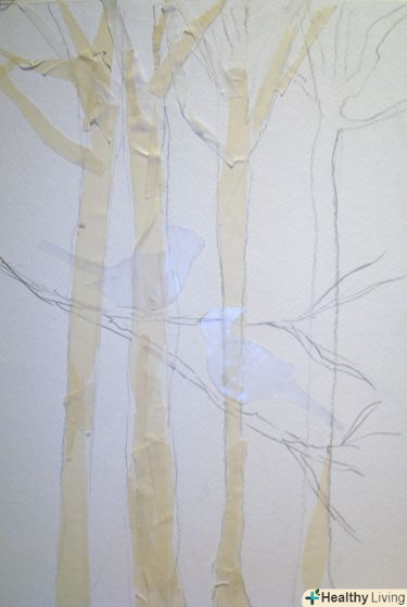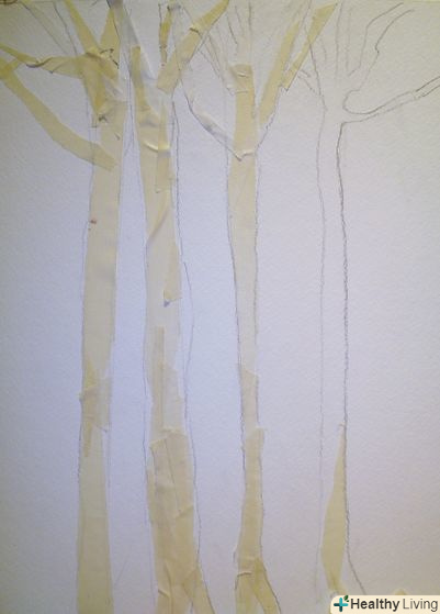 Простим олівцем зробіть начерки чотирьох беріз. між стовбурами дерев залишайте різний по ширині і формі простір. Ближче до верхнього краю листа намалюйте гілки. Відірвіть кілька смуг бежевого малярного скотча і заклейте їм стовбури дерев; добре притисніть і зафіксуйте скотч. Відріжте і порвіть уздовж коротші шматочки скотча і покрийте ними гілки на верхівці дерев. Простим олівцем зробіть начерки чотирьох беріз. між стовбурами дерев залишайте різний по ширині і формі простір. Ближче до верхнього краю листа намалюйте гілки. Відірвіть кілька смуг бежевого малярного скотча і заклейте їм стовбури дерев; добре притисніть і зафіксуйте скотч. Відріжте і порвіть уздовж коротші шматочки скотча і покрийте ними гілки на верхівці дерев.- Крім того, якщо вам не хочеться возитися зі скотчем, можна просто зафарбовувати ділянки навколо дерев, як це показано на прикладі крайнього правого стовбура.