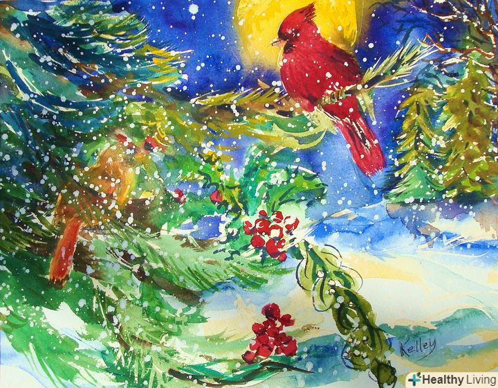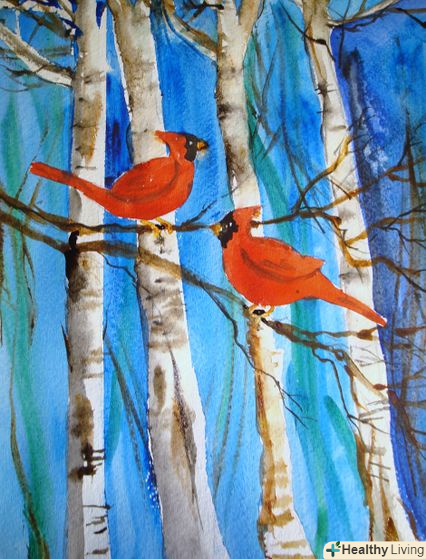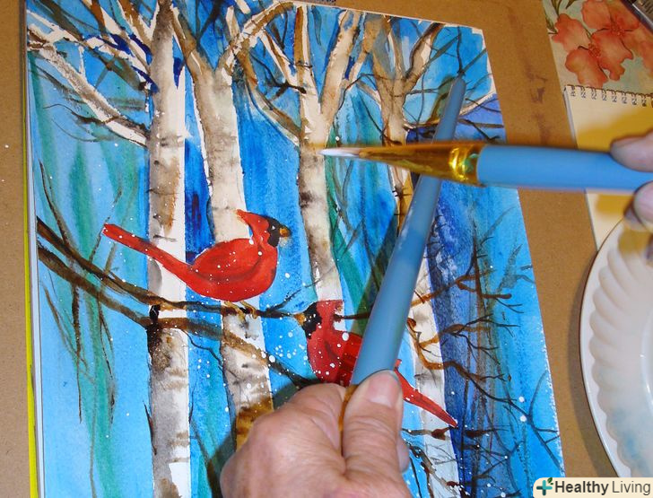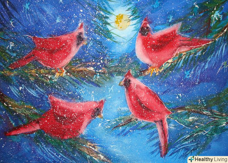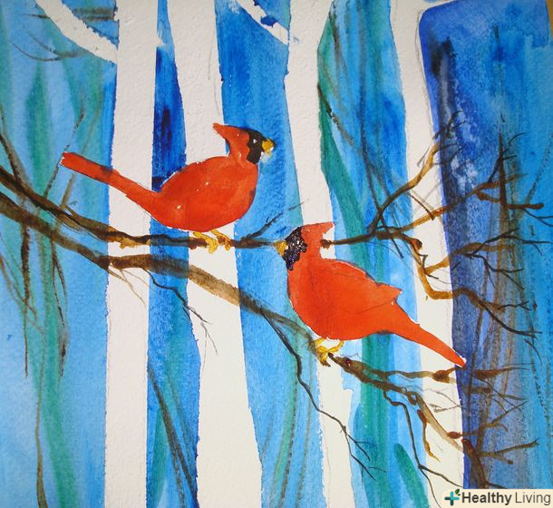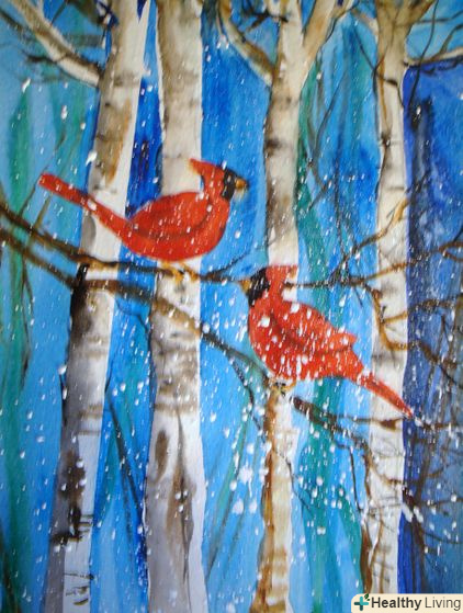 Коли приходить зима, і природні фарби блякнуть, червоні кардинали радують погляд, особливо якщо вони влаштувалися на світлих березах. Цей малюнок виконаний у трьох простих техніках живопису аквареллю: місця, де будуть стовбури дерев, покриваються малярським скотчем, щоб зберегти білизну паперу, Птахи вирізаються з самоклеючого цигаркового паперу, а біла фарба розбризкується на малюнок, щоб зобразити падаючий сніг.