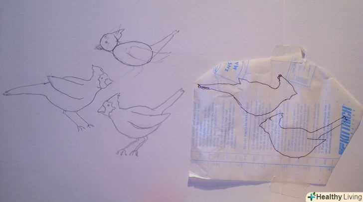 На задній стороні самоклеючого паперу намалюйте силуети двох червоних кардиналів. нехай вони дивляться в різні боки. Намалюйте овал для тіла птиці, коло для голови; до голови прірісуйте дзьоб і чубчик, до тіла хвіст і крила. Поки що не малюйте лапи, щоб фігурки були компактніше. Виріжте фігурки птахів і відкладіть їх в сторону. На задній стороні самоклеючого паперу намалюйте силуети двох червоних кардиналів. нехай вони дивляться в різні боки. Намалюйте овал для тіла птиці, коло для голови; до голови прірісуйте дзьоб і чубчик, до тіла хвіст і крила. Поки що не малюйте лапи, щоб фігурки були компактніше. Виріжте фігурки птахів і відкладіть їх в сторону.