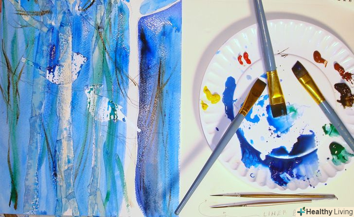 Помістіть акварель відтінків синього (кожен окремої пензлем) в центр палітри і розведіть водою до консистенції молока. нанесіть синій колір на лист довгими мазками у напрямку зверху вниз. Фарби не повинні бути непрозорими, але в той же час потрібно, щоб вони були досить насиченими, щоб за один мазок на папері залишався потрібний відтінок. Додайте трохи зеленого кольору. Залиште малюнок до висихання або скористайтеся феном для волосся. Помістіть акварель відтінків синього (кожен окремої пензлем) в центр палітри і розведіть водою до консистенції молока. нанесіть синій колір на лист довгими мазками у напрямку зверху вниз. Фарби не повинні бути непрозорими, але в той же час потрібно, щоб вони були досить насиченими, щоб за один мазок на папері залишався потрібний відтінок. Додайте трохи зеленого кольору. Залиште малюнок до висихання або скористайтеся феном для волосся.