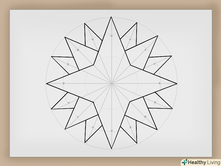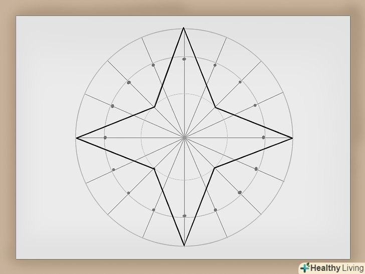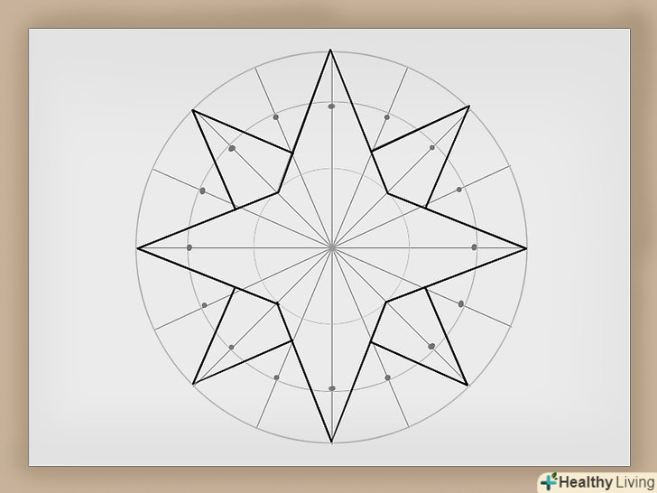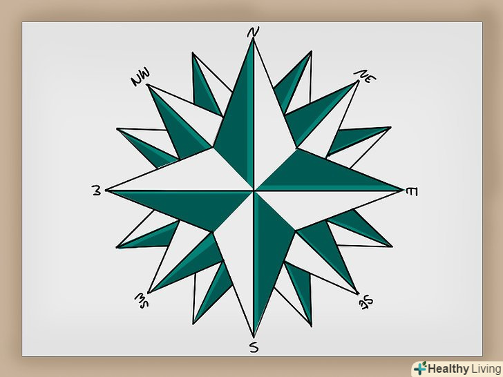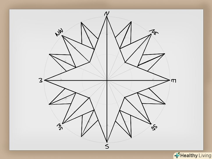 - Повторіть процес із зовнішньою точкою 90° (E - Схід), з'єднавши її лініями з точками 45° і 135° на внутрішній окружності; з зовнішньою точкою 180° (S - Південь), з'єднавши її лініями з точками 135° і 225° на внутрішній окружності, і з зовнішньою точкою 270° (W - Захід), з'єднавши її лініями з точками 225° і 315° на внутрішній окружності. Повинно вийти схожим на наведене тут зображення.