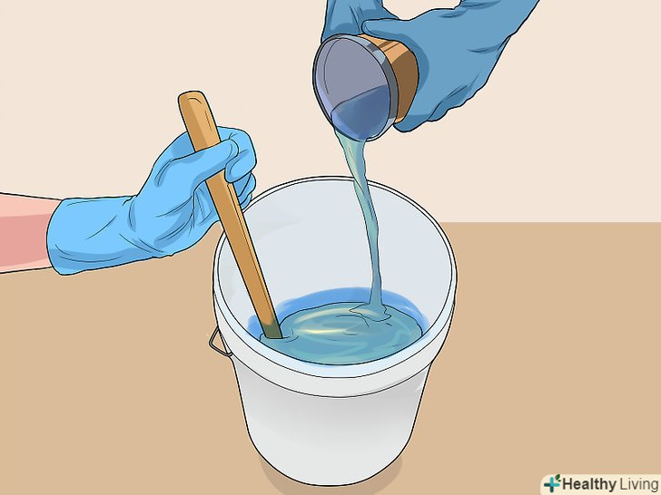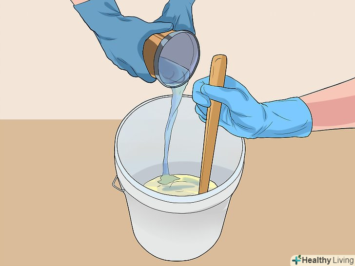 Помішуйте фарбу в той час, як поступово додаєте в неї воду. щоб ретельно перемішати фарбу з водою, використовуйте спеціальну лопатку для змішування фарб. Заважайте фарбу круговими рухами по висхідній і низхідній спіралі. Періодично виймайте лопатку з фарби, щоб перевірити, як фарба стікає з неї назад у відро. Якщо фарба все ще залишається грудкуватою або продовжує прилипати до лопатки, додайте в неї трохи більше води. Повторюйте процедуру до тих пір, поки фарба не придбає однорідну кремоподібну консистенцію. [7]- Ніколи не додавайте в фарбу всю воду відразу. Робіть це поетапно невеликими обсягами. Перш ніж додати в фарбу додаткову кількість води, не забувайте вийняти з неї лопатку для змішування, щоб перевірити, чи стала фарба однорідною або як і раніше залишилася грудкуватою. Повторюйте всі дії в міру необхідності.