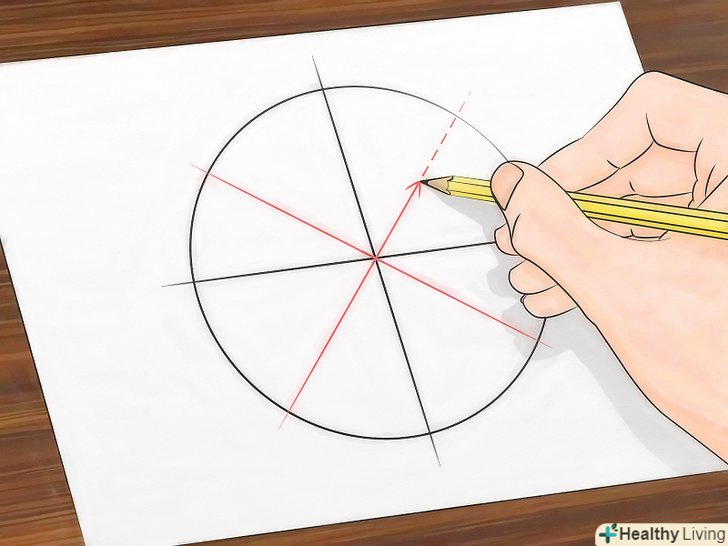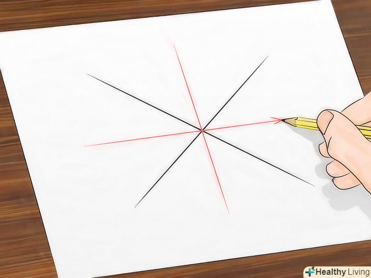 Намалюйте діагоналі від центру, що ділять ділянку на вісім секцій. вони повинні бути коротшими, ніж оригінальний хрест. Намалюйте діагоналі від центру, що ділять ділянку на вісім секцій. вони повинні бути коротшими, ніж оригінальний хрест.