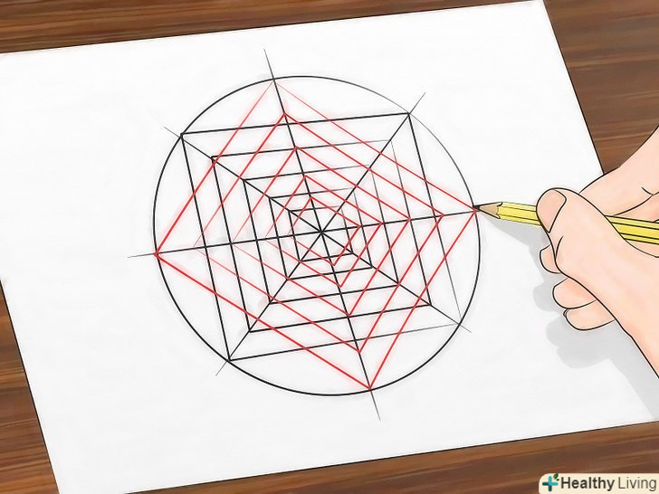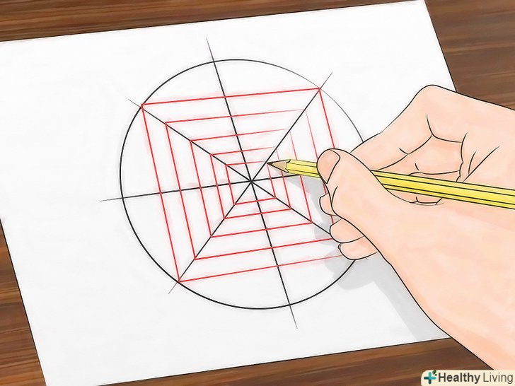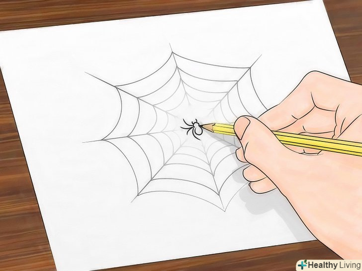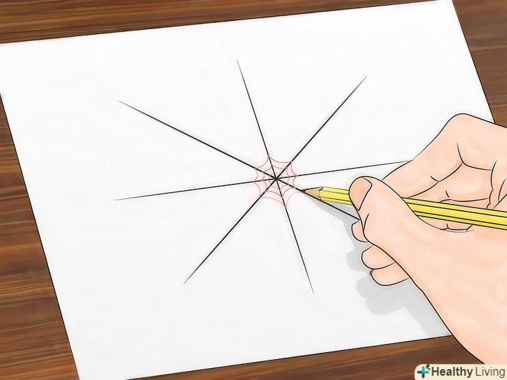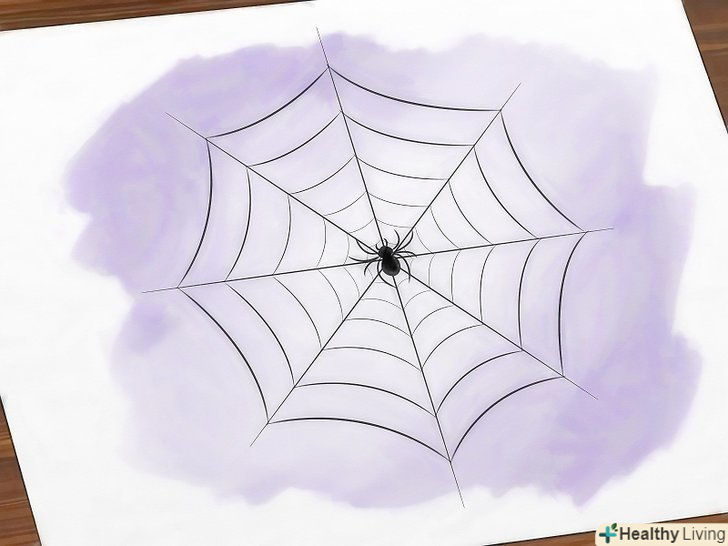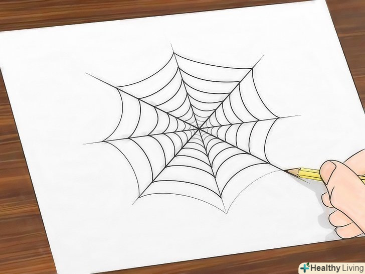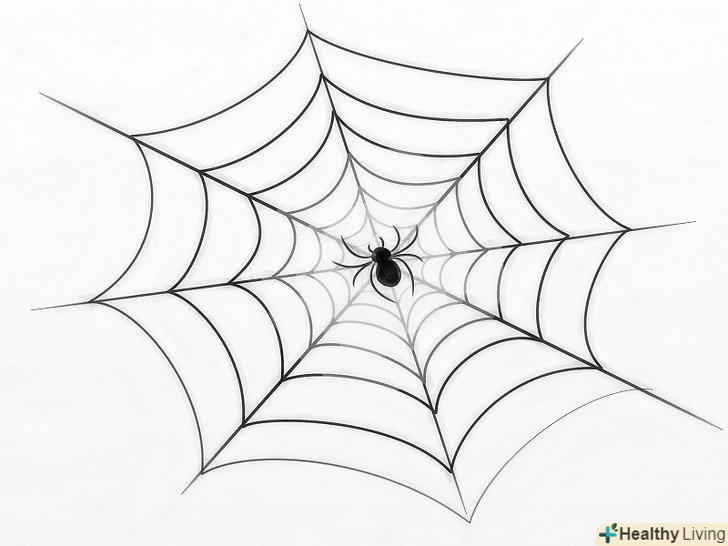 Домалювавши павутину до кінця, подовжите діагоналі, щоб вони виглядали як кріплення павутини. Домалювавши павутину до кінця, подовжите діагоналі, щоб вони виглядали як кріплення павутини.