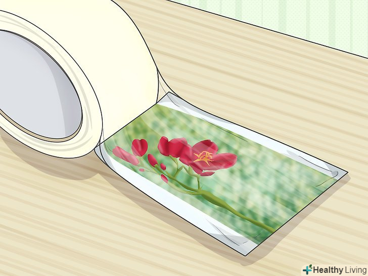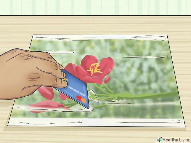 Згладьте скотч краєм кредитної картки. ретельно пройдіться краєм кредитної картки по скотчу з малюнком, щоб позбутися від з'явилися бульбашок повітря. [3] якщо між малюнком і скотчем залишаться бульбашки повітря, це негативно відіб'ється на якості малюнка після його перекладу на скло.- Якщо у вас немає під рукою кредитної картки, скористайтеся, наприклад, водійськими правами або чимось подібним.