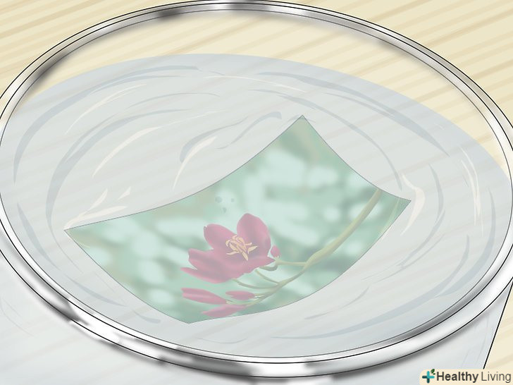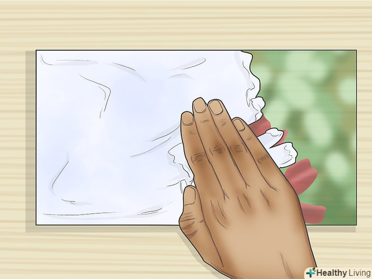 Круговими рухами великого пальця потріть поверхню паперу, щоб видалити її. якщо папір просочилася водою, її можна зняти зі скла. Робіть невеликі кругові рухи великим пальцем - розмокла букага буде скочуватися. [14]- Коли ви видалите весь папір, на поверхні скла ви побачите картинку, яку перекладали. Зображення з гелем для декупажу повинно залишитися на склі, коли ви зітрете всі залишилися шматочки паперу.