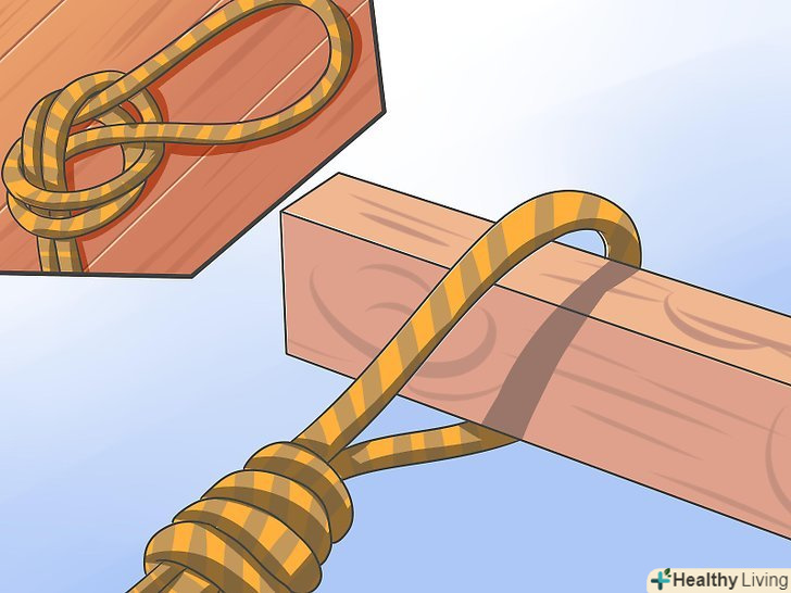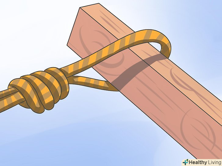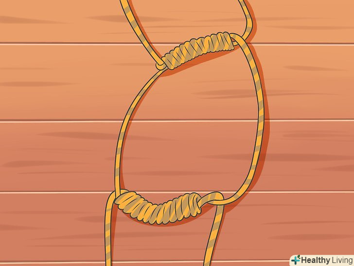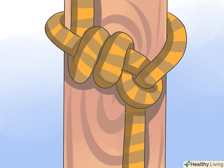 - Можна також взяти робочий кінець мотузки і обернути їм гілку не менше трьох разів. Візьміть робочий кінець і покладіть його поверх основної частини мотузки. Тепер оберніть гілку мотузкою ще кілька разів з іншого боку. Підсуньте кінець знизу і туго затягніть. Такий вузол добре протистоїть горизонтальним навантаженням, тому краще закріпити сходи на горизонтальних кріпленнях. Якщо ви хочете зробити вузол тугіше, обмотайте гілку мотузкою ще кілька разів. [13]