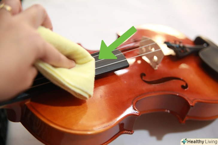 Протріть струни.струни необхідно протирати після кожного використання скрипки, так як на них дуже швидко накопичується каніфоль, через що інструмент звучить інакше. Ця проста дія повинна стати постійною звичкою.- За допомогою однієї ганчірки зітріть каніфоль з кожної струни окремо, рухаючись вгору і вниз ковзаючими рухами. Обов'язково Видаліть всі пластівці каніфолі, які зібралися на струнах.
