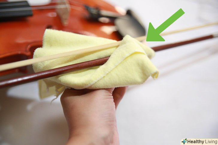 Протріть смичок.каніфоль швидко накопичується не тільки на струнах, але і на смичці. Можна використовувати ту ж ганчірку, що і для струн, так як ви будете видаляти зі смичка те ж саме речовина.- Як і у випадку зі струнами просто візьміть серветку і протріть смичок уздовж волосся. Легко рухайтеся вгору і вниз, але не поперек волокон.