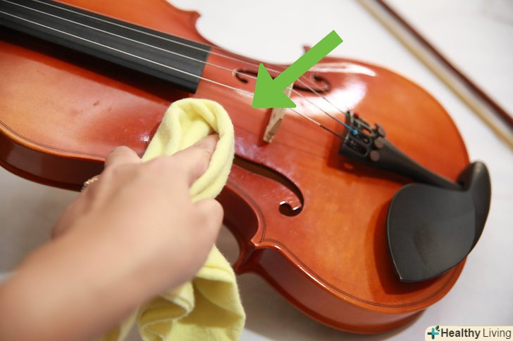 Протріть верхню деку скрипки.верхня дека знаходиться на корпусі, а над нею натягнуті струни, які йдуть на гриф. На даному етапі використовуйте іншу ганчірку, щоб не натерти скрипку каніфоллю або іншою речовиною.- Слідкуйте за тим, щоб ганчірка не зачепилася за резонаторні отвори у формі літери "F". Ці отвори мають дуже тонку обробку, пошкодження якої може привести до зміни або погіршення звучання скрипки.[2]