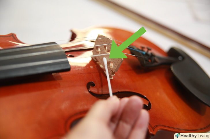 Очистіть підставку.під час гри на скрипці на підставці також збирається каніфоль. За допомогою ганчірки видаліть каніфоль з-під підставки, але не докладайте надмірних зусиль, щоб не пошкодити настільки крихкий елемент.- Щоб видалити каніфоль з важкодоступних місць, можна використовувати ватні палички.