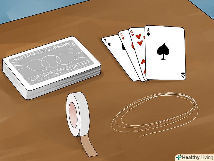 Зробіть необхідні приготування. Приклейте волосінь до зворотного боку карти прозорим скотчем, так щоб це не було помітно. Постарайтеся приклеїти волосінь до центру зворотного боку карти.