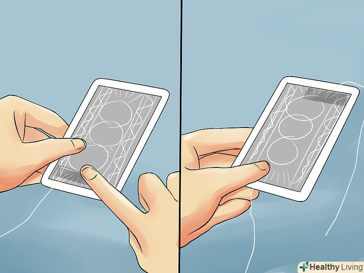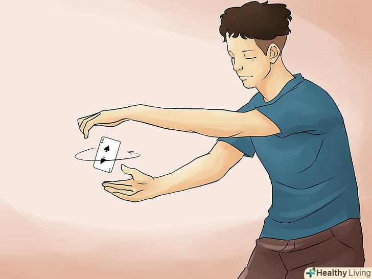 Потренуйтеся виконувати фокус. Перетасуйте колоду карт, поки не підготуєтеся до виконання трюку, і при цьому будьте уважні, щоб не заплутатися в Невидимій волосіні. Після цього підніміть руку з волосінню, розведіть пальці і протягніть вказівний і середній пальці в невидиму волосінь. При цьому вільно утримуйте перед собою колоду карт: коли ви піднімете руку, прив'язана карта вислизне з колоди і повисне на невидимій волосіні. [19]- Можна також перетасовувати колоду карт до тих пір, поки ви не будете готові виконати трюк, а потім витягнути з неї прив'язану карту і змахнути рукою так, як це робиться при киданні літаючого диска. В результаті карта швидко закрутиться і повисне в повітрі. Постарайтеся при цьому не прикладати зайвих зусиль! Якщо ви занадто різко підкинете карту, глядачі можуть здогадатися, що вона висить на вашій руці. [20]