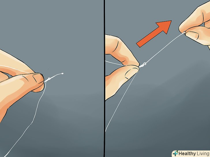 Зав'яжіть на волосіні петлю. щоб швидко і непомітно виконувати цей фокус, необхідно зав'язати на вільному кінці волосіні петлю, або простий ковзний вузол. З його допомогою ви зможете прикріпити волосінь до гудзика на своїй сорочці, пряжці ременя або іншому місцю на своєму тілі, наприклад до рукаву.- Відрегулюйте довжину волосіні. Вона повинна бути досить довгою, щоб карта звисала з вашої руки і могла при цьому крутитися.