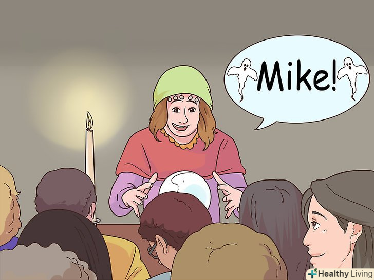 Заздалегідь виберіть "жертву", якщо ви виступаєте на публіці. виділіть кого-небудь з натовпу і трохи за ним постежите. Прислухайтеся до будь-якої корисної інформації, якою може поділитися людина і яка стосується його життя. Пізніше ви зможете нею скористатися. Коли ви будете готові почати, скажіть об'єкту, що ви відчуваєте потужну енергію, що надходить від нього, і тому ви хочете "прочитати" його в першу чергу. [2]- Наприклад, якщо ви почули, як хтось згадав свого кращого друга Мішу, ви можете згадати це ім'я під час свого сеансу, щоб довести, що ви-справжній посередник загробного світу.