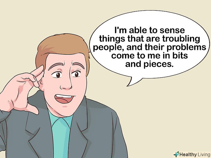 Замініть питання на затвердження. ця техніка, відома як "закидання вудки", дозволить вам дізнатися ті речі про людину, які ви зможете використовувати пізніше, під час свого читання. Закидайте вудку в пошуках інформації до тих пір, поки "жертва" не проковтне наживку і не підтвердить одне з ваших тверджень. [6]- Наприклад, можна сказати: "мені приходить образ намиста, цікаво чому?"Якщо людина не реагує, рухайтеся далі і продовжуйте. "Я бачу розмите зображення Білого дому, що б це могло означати?”. Якщо об'єкт підстрибує і каже, що його бабуся живе в Білому домі, використовуйте цю інформацію як відправну точку для вашого читання.