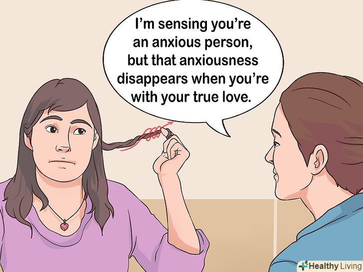Дозвольте "жертві" керувати ходом розмови. багато людей, які приходять до ворожок зі своїми проблемами і бажаннями, вже тепер все зважили у себе в голові. Якщо об'єкт прагне щось обговорити або постійно піднімає одну і ту ж тему, поверніть читання в це русло. Людина з більшою готовністю повірить вам, якщо ви будете говорити йому те, що він хоче чути. [10]- Наприклад, якщо "жертва" постійно згадує свого колишнього партнера, можна сказати: "не так давно вам розбили серце, і тепер вам важко рухатися далі. Ваші минулі відносини висять важким тягарем на вашій душі".