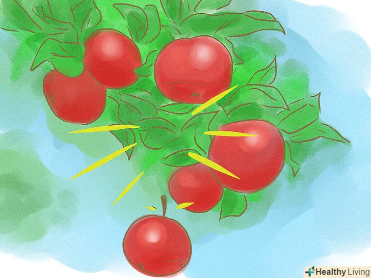 Дочекайтеся, коли з дерева впаде кілька яблук. яблуні самі скидають плоди, коли вони повністю дозріли, щоб поруч виросли нові дерева. Слідкуйте за тим, коли з дерева почнуть падати яблука.- Зрілі плоди можна знімати з дерева без зусиль. Достатньо лише потягнути яблуко трохи вгору і злегка провернути. Намагайтеся не тягнути плоди вниз і не зривати з гілки із зусиллям.