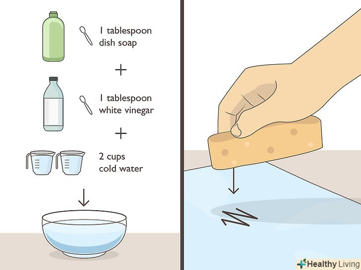 Видалити маркер з синтетичних тканин можна сумішшю столового оцту і засоби для миття посуду. змішайте в мисці 1 столову ложку (15 мл) засобу для миття посуду, 1 столову ложку (15 мл) столового оцту і 2 склянки (470 мл) холодної води. Перемішайте до однорідної консистенції. Потім чистою губкою нанесіть розчин на пляму промакающімі рухами. Протягом 5-30 хвилин кілька разів намочіть і промакніте пляма розчином, збираючи рідину чистим паперовим рушником. [9] потім змийте залишки розчину з тканини холодною водою. Промокніть тканину чистим паперовим рушником, щоб трохи її підсушити.- Столовий оцет і засіб для миття посуду ефективно виводять сліди від перманентного маркера з синтетичних тканин, наприклад з меблевої оббивки або синтетичних килимів.