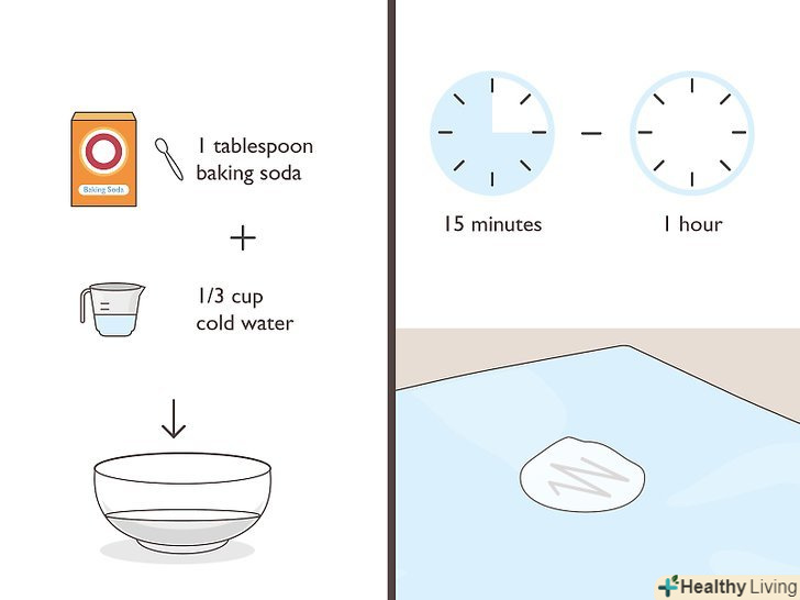Харчова сода-універсальний засіб для виведення плям. приготуйте кашку з 1 столової ложки (14,4 г) питної соди і 1/3 склянки (80 мл) холодної води. Розподіліть кашку по плямі рівним шаром. Легкими круговими рухами втирайте соду в пляму і почекайте від 15 хвилин до години. Потім виперіть річ в машині в звичайному режимі. [10]- Питну соду можна використовувати для видалення слідів перманентного маркера з оббивки, килимів та одягу.