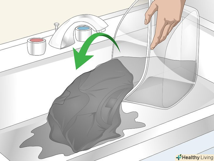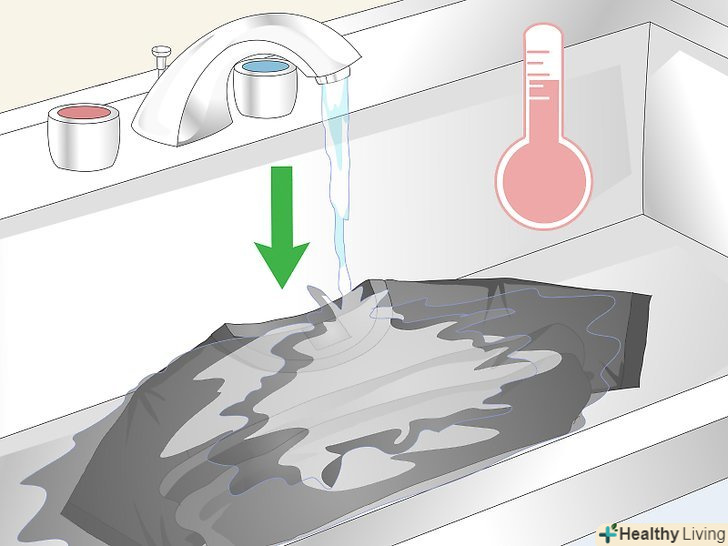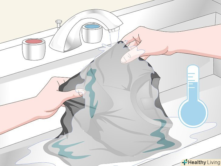 Спочатку змийте зайву фарбу гарячою водою. сполосніть виріб в раковині або ванні, куди ви вилили фарбу. Розгорніть тканину, щоб проточна вода промила всю її поверхню. [10]