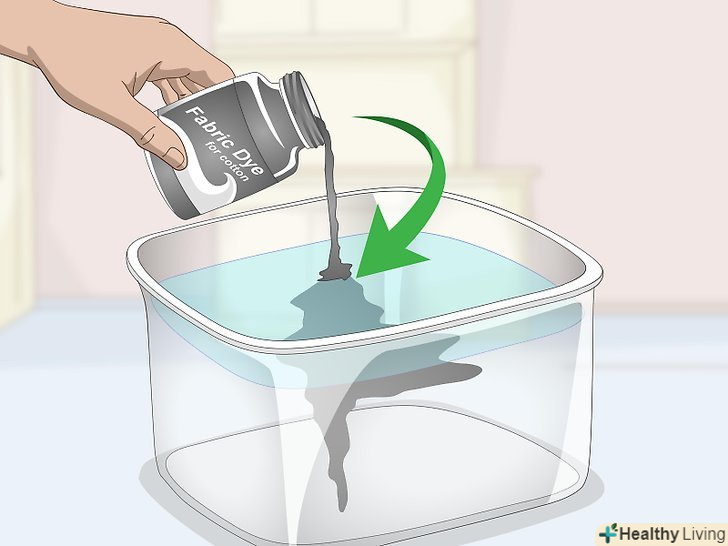 Вилийте чорний барвник в ємність з водою. Погляньте на етикетку зі зворотного боку барвника, щоб дізнатися, скільки потрібно лити. Чим більше барвника ви додасте, тим темнішою стане річ. Якщо ви хочете, щоб тканина забарвилася в суцільний чорний колір, вилийте весь вміст баночки. Ложкою гарненько розмішайте фарбу. [4]- Чорний барвник можна замовити онлайн або купити в магазині товарів для рукоділля.