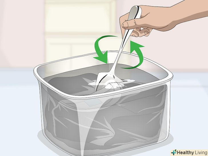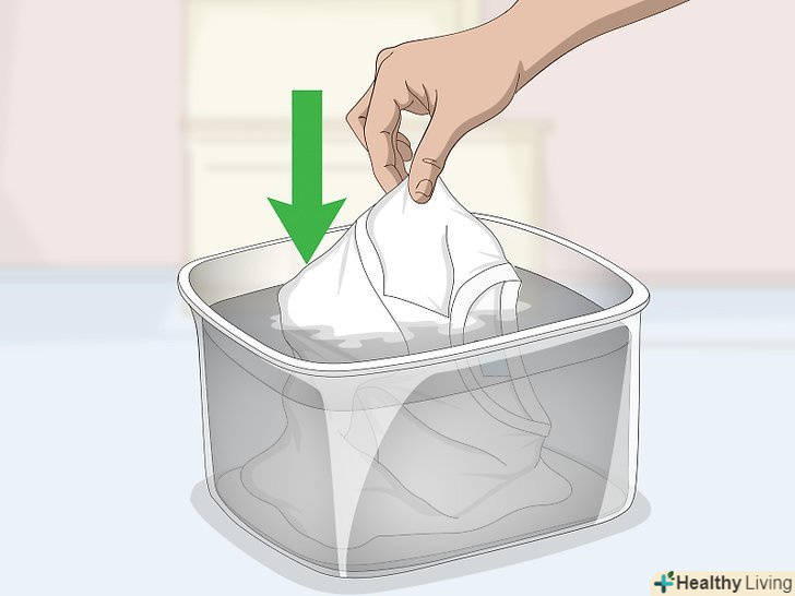 Опустіть виріб в фарбувальну ванну. тканину необхідно повністю занурити під воду. Натисніть на тканину лопаткою або ложкою, щоб видавити з неї бульбашки повітря. [6]