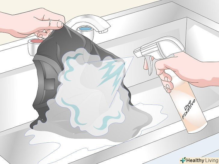 Перш ніж сполоснути тканину, нанесіть на неї фіксатор фарби, щоб колір став більш насиченим. завдяки фіксатору фарба краще вбереться в волокна і зробить остаточний колір більш насиченим. Якщо ви вирішите використовувати фіксатор, обприскати їм всю поверхню виробу. Зачекайте 20 хвилин, щоб фіксатор проник у волокна тканини. [9]- Фіксатор фарби можна замовити онлайн або купити в магазині товарів для рукоділля.